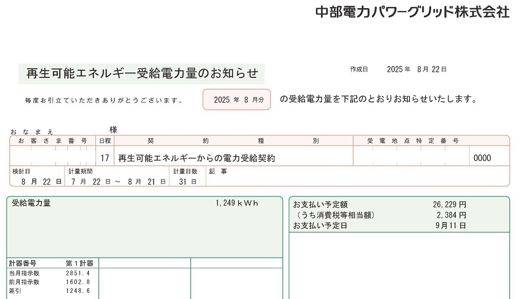 再エネ受給電力量:1,249 kWh = 26,229 円