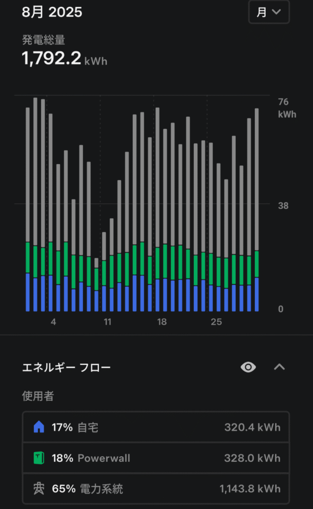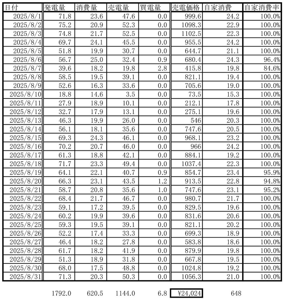 ※蓄電池のテスラアプリから実記録データを抽出(8月1日~8月31日)