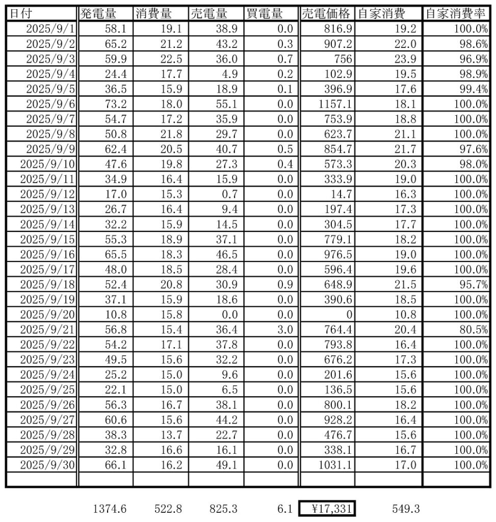 ※蓄電池のテスラアプリから実記録データを抽出(9月1日~9月30日)